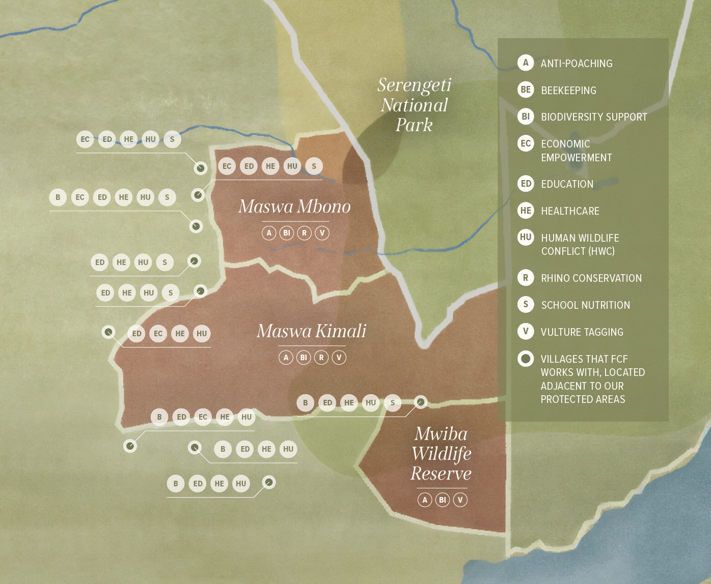 FCF operates within three vast and vital tracts of wilderness, Mwiba Reserve, Maswa Kimali and Maswa Mbono, which lie along the southern and western boundaries of Serengeti National Park. Together, these areas span about 2,000 square kilometers or approximately 800 square miles, an area roughly the size of Luxembourg.